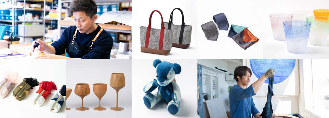 靛蓝染色(德岛县) / 木目人偶(埼玉县) / 京都器・清水器(京都府) / 刺子绣(爱知县) / 笠间器(茨城县) / 山中漆器、木工(石川县) / 玻璃制品(群马县) / 小花东京染(东京都) / 东京和服绦带(东京都) / 轮岛漆器(石川县)